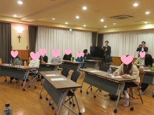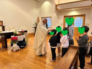 朝9時半からは、子どもたちの幼稚園の園長先生でもある濱口神父様によりクリスマスの御ミサがあり、静かで厳かなひとときを過ごしました。続いて、シスター青木総長様から子どもたちへクリスマスのお話をしていただきました。