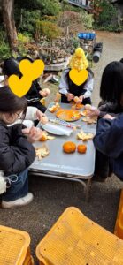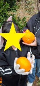 午前中は収穫作業を行い、子ども達は夢中になり、大小様々なみかんを収穫し「見てー!」と誇らしげな笑顔!寒さも吹き飛ぶほど、元気に活動できました。