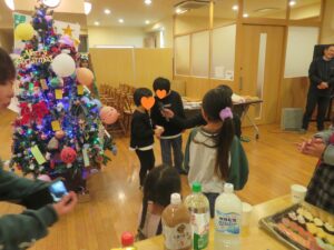 夕方からは、栄養士を中心に考えられた特別なクリスマスメニューを囲み、普段は各ユニットで食事をしている子どもたちと職員がみんなホールに集まり、食卓を共にし楽しみました。夕食後のビンゴ大会も大盛り上がりとなり、思い出に残る時間となりました。