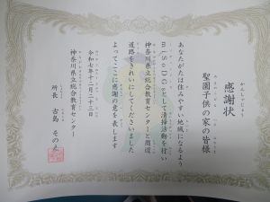毎月第1、第3日曜日の午前中に活動していますが、この度、聖園子供の家のお隣にあります、県立総合教育センターの皆さまより「地域クリーン活動」に対する感謝状を贈呈していただきました。