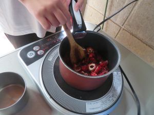 種を取って、よく洗って、トロトロになるまで鍋で煮込んで・・・特に味つけはせず、素材の味をソースにしました。ソースだけでは・・・とのことで、アイスクリームやチョコレート、ヨーグルト等でパフェ作り!その上から「ローゼルソース」をかけて完成!どの子も個性溢れるパフェを作ることができました。