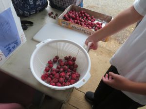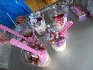 種を取って、よく洗って、トロトロになるまで鍋で煮込んで・・・特に味つけはせず、素材の味をソースにしました。ソースだけでは・・・とのことで、アイスクリームやチョコレート、ヨーグルト等でパフェ作り!その上から「ローゼルソース」をかけて完成!どの子も個性溢れるパフェを作ることができました。