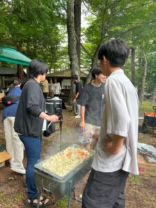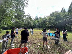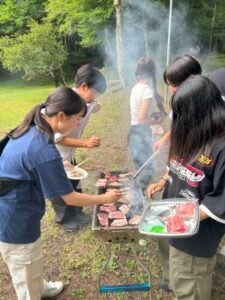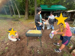 夕方からは栄養士が中心となり、みんなでバーベキュー。子どもたちは率先してお肉を焼き、大好きな焼きそばやお肉を頬張りながら笑顔いっぱい。中には苦手なピーマンを生でかじり「おいしい!」と驚きの声も。外で食べるごはんの特別感が、食の幅も広げてくれたようでした。