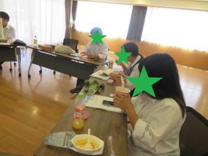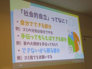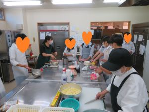 2日目は善行市民センターで、施設退所後に必要な手続きや行政との関わりについての話を聞きました。その後は「簡単1人暮らしメニュー」をテーマに、スーパーで各自が買い物をし、園の厨房で調理。意外にも手際よく、手軽ながらも工夫された料理が並びました。