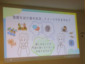 今年から聖園子供の家独自で取り組むこととなったMAP(自立支援プログラム)の初年度。高校1〜3年生を対象に、まずは「あすなろサポートステーション」への訪問からスタートしました。施設退所後に直面する“つまずきポイント”や、職員によるリアルな一人暮らし体験談など、身近で具体的な内容が多く、子どもたちは真剣な表情で話を聞いていました。